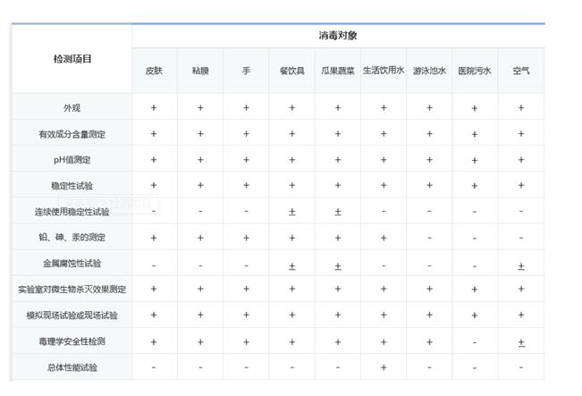 消毒液(劑)的測試標準為:EN 1276:1997《食品業、工業、家用和公共場所設備中測試消毒劑和防腐劑的殺菌作用的定量懸浮液試驗》。具體檢測項目如下: