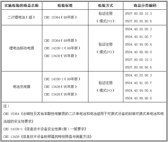 根據2013年7月26日的會議記錄,臺灣經濟部標準檢驗局(BSMI)將計算機、通訊和消費電子三類產品(簡稱3C電子產品)中的二次鋰電池(組)、鋰電池移動電源和電池充電器納入其強制性商品檢驗范圍,新規定將從2014年3月1日開始實施。